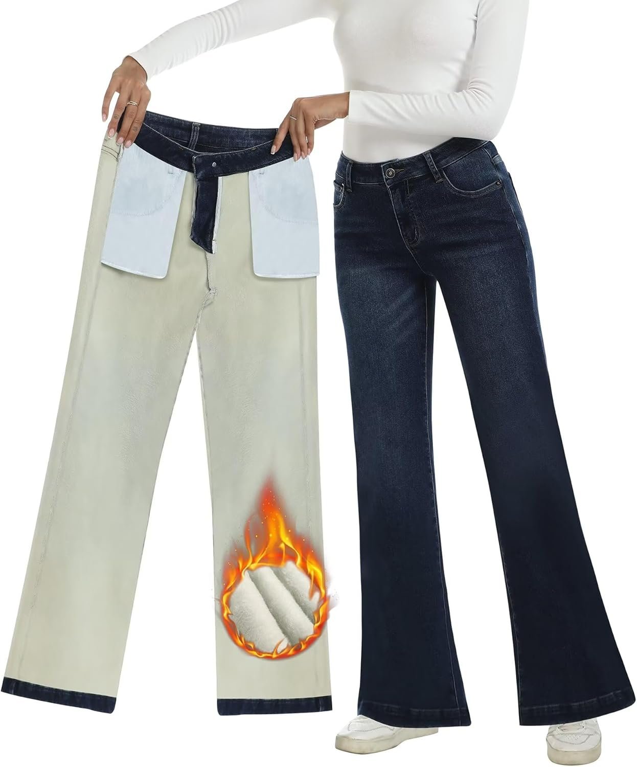Fleece Lined Jeans Women High Waisted Stretchy Winter Jeans Warm Thermal Pants Thick Bell Bottom Wide Leg Jeans Woman