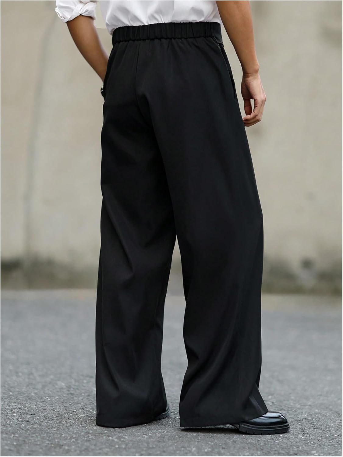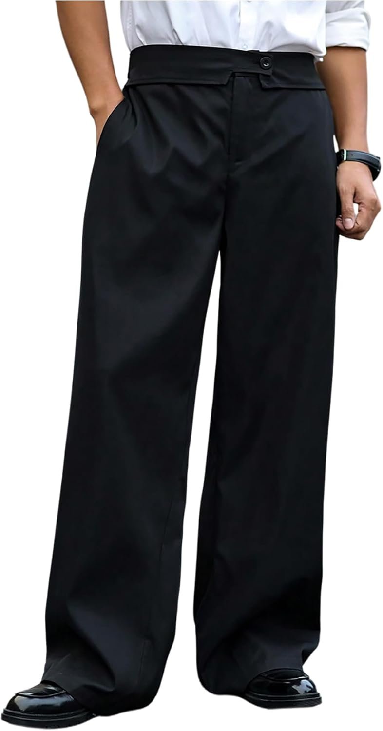 Men’s Wide Leg Work Dress Pants Button Long Trousers with Pockets