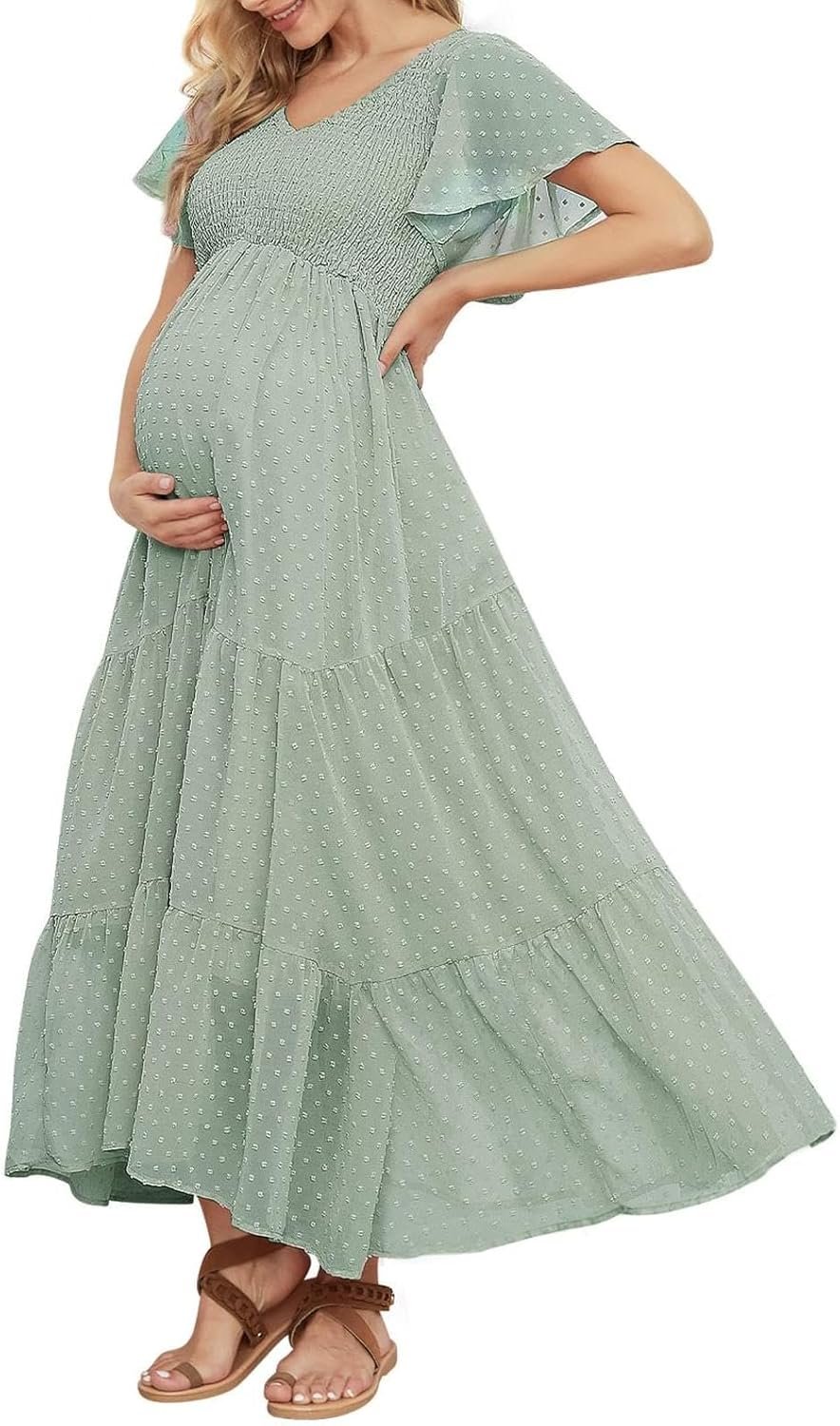 - [Elegant& Stylish] We can’t help but fall in love with how elegant the Boho Swiss Dot Smocked Tiered Maternity Maxi Dress is! Swiss dots and flattering flounce hem adds femme and elegance to this breezy, woven dress with a V neckline, smocked bodice, and short ruffle loose sleeves.