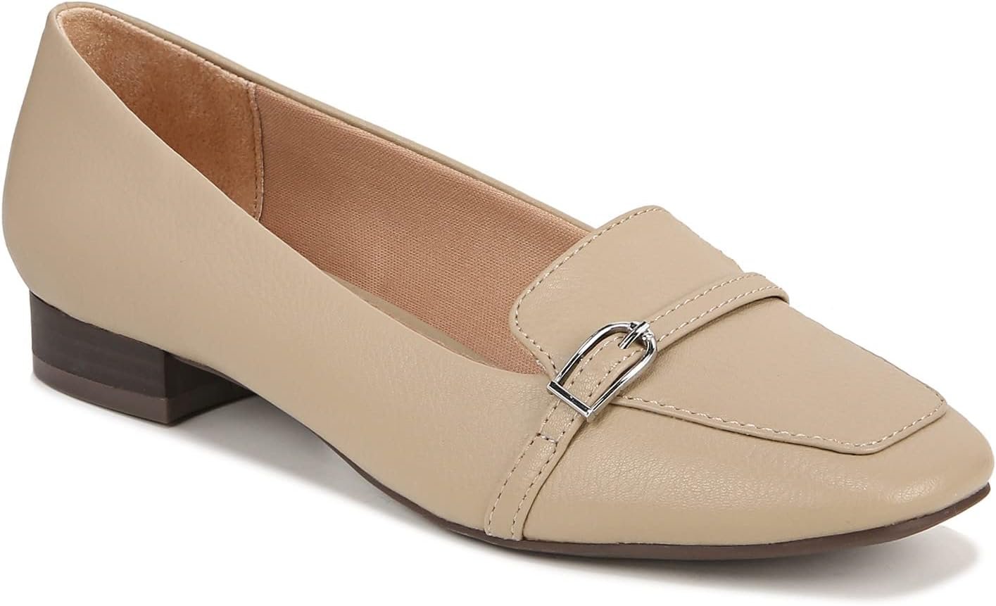 • Faux leather upper with a subtle square toe, slip-on fit, and decorative strap with metallic buckle detail