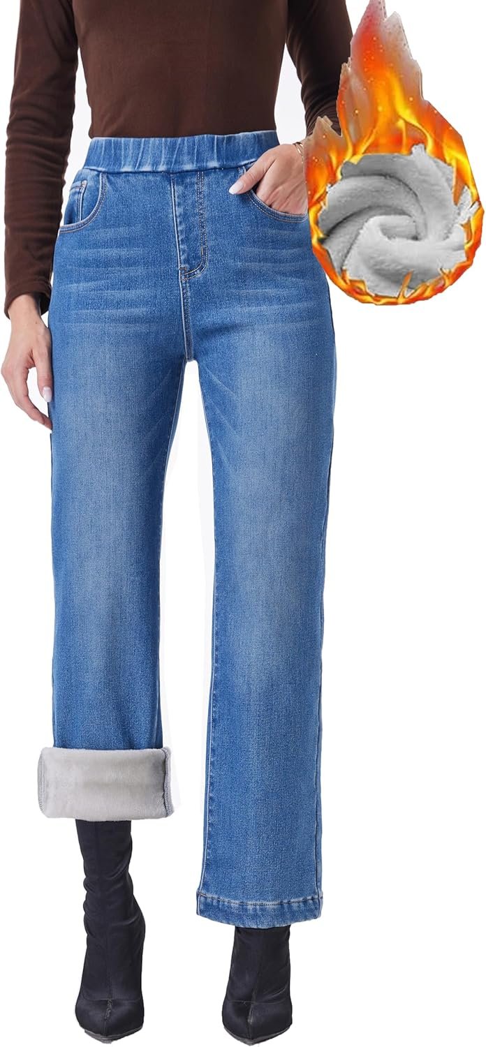 - Wide Leg Jeans for Winter Fleece Lined Casual Jean: pull on wide leg jean has more room relaxed fitting,allowing you to wear them with booties underneath without tucking them in
